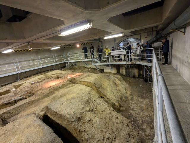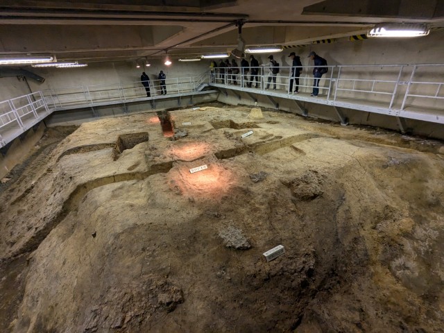 木瓜原遺跡の地下保存施設 クインススタジアム脇の「遺跡保存施設」と書いてある扉をあけ階段を下りてトンネルを40mぐらい歩くと、製鉄炉本体や須恵器窯の一部が原型のままきれいな形で保存されています。