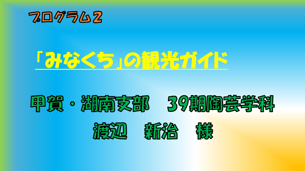 「終の住処」となる「水口」の歴史文化等を学ぶ目的で入会をした水口観光ボランティアガイド部会(今年から甲賀市観光ボランティアガイド会)で活動しています。水口は水口城・水口岡山城の二つの城の城下町として、また東海道五十三次の五十番目の宿場町として繁栄してきましたので史跡や文化財が豊富です。こうした歴史文化の魅力を観光客の皆様や地域の皆様と触れ合い理解を深めています。水口のみどころ紹介とガイド活動について紹介します。 |