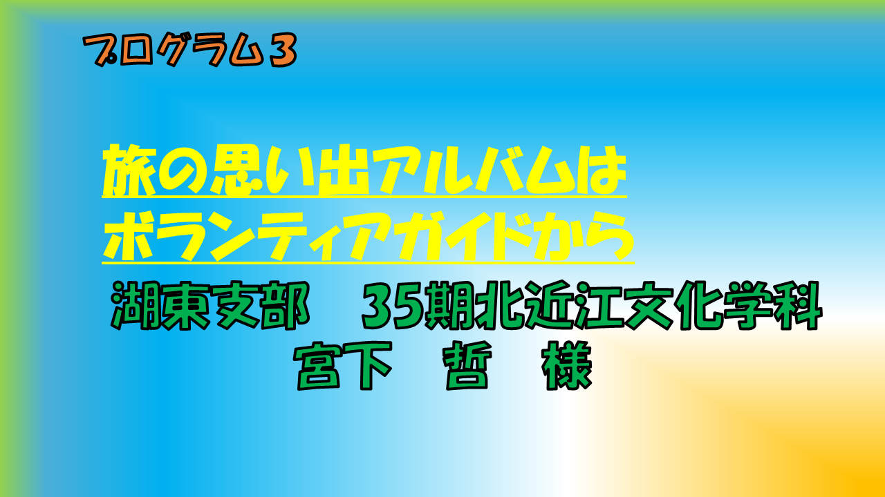 彦根ボランティアガイド協会の会員で観光ガイド活動を行っています。観光の案内を実施するときお客さんに何を説明すればよいか、毎回説明内容が同じではないことから、お客様の旅の思い出になることは何かを考えながらガイドを実施しています。最近は動画制作にかかわる機会があり、映像としての観光スポットの紹介の難しさから、案内コースのポイントをどのように設定するか悩むところです。いろいろな視点からの観光案内の活動状況を報告します。 |