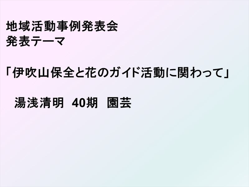サラリーマン時代、庭のない暮らしを強いられていたことより、退職後は庭のあるガーデニングライフを夢見ていました。緑あり草津市に土地を得て、庭作りを行い、同時に草津市が進めていたガーデンシティ草津を促進するためのワークショップに参加、市内の花壇整備ボランティアを開始、シルバー人材センターの植木班への入会、レイカディア大学OB会との出会い、その後のボランティア活動を紹介します。 |