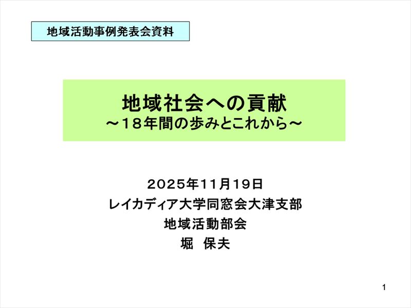 同窓会活動の3本柱、「地域社会への貢献」について、大津支部40周年を機会に、これまでの歩みを振り返ります。 2007年の大津祭りボランティア、2012年の小学校応援活動(校庭美化から図書・縫製授業支援)から広がり、今では30校を超える小学校・幼稚園で活動し、子供たちの感謝の手紙にシニアのやりがいが育っています。一方で、平均年齢75歳は体力の限界、これからの活動への課題と対応を考える時期に来ています。皆さんの助言を待ってます。 |