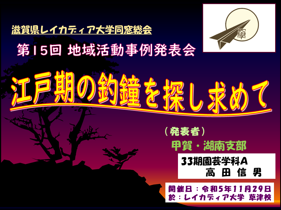 地元の郷土史会会員として毎年の会報への投稿を目標に身近な歴史を調べる中、地元のお寺の釣鐘を調べ始めると次々に興味深いことが明らかになってきた。市内49カ所の釣鐘を調査した概要を報告し、釣鐘の響きだけでなく歴史的な経緯を語り継ぎたい。 |
