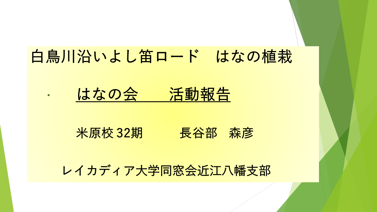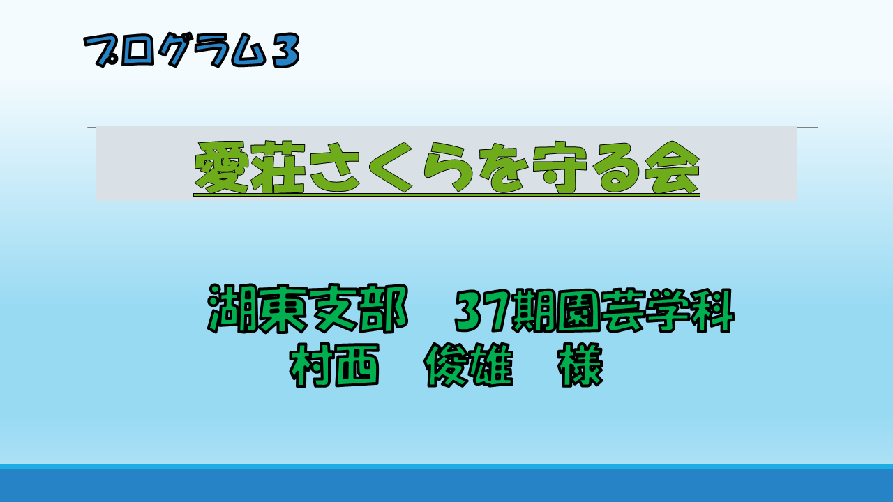 愛荘町は2006年に旧愛知川町と旧秦荘町が合併し、町のシンボルとして、花は「さくら」、 木は「もみじ」と定められました。そこで住民のボランティア活動として町内のさくらの管理として剪定と新たな植樹活動を展開するため「愛荘さくらを守る会」が発足した。会員は現在レイ大OB7名を含め29名であり、剪定延べ約2,000本、植樹は370本になりました。 |