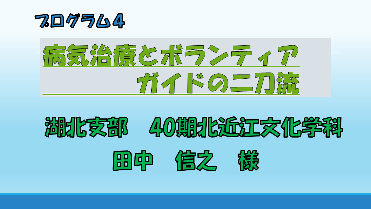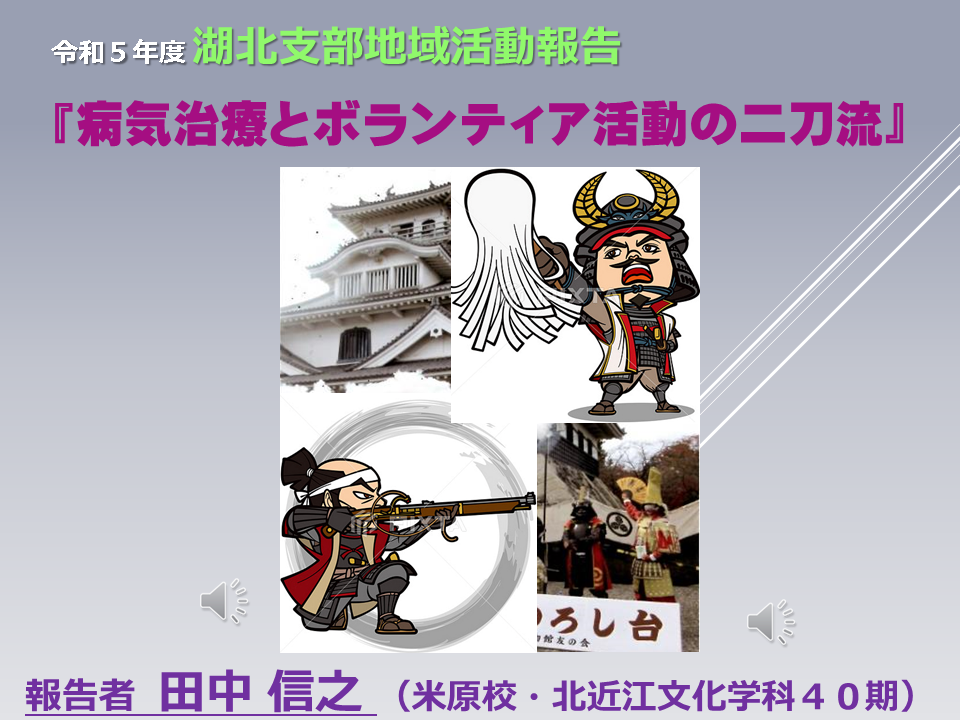 | 私は大きな病を患っていてその治療の傍ら長浜市でボランティアガイド協会会員として全国から訪れる観光客と一期一会の出会いを楽しみに活動を行っています。病気治療とガイドの二刀流で歴史の宝庫・長浜の魅力を伝えることは自分の励みにもなり、生き甲斐の1つにもなっています。そんな私の姿と長浜の魅力をお伝えしたいと思っています。 |