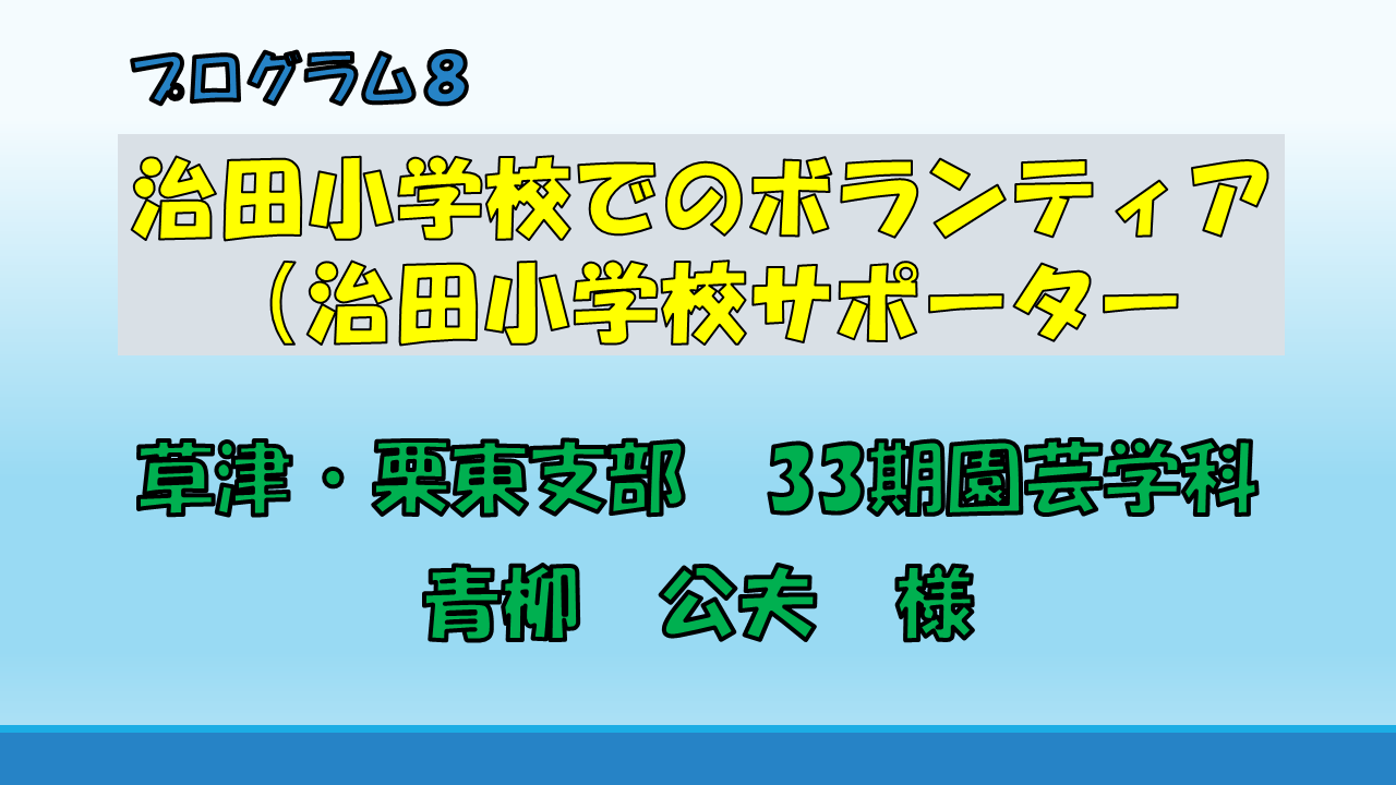 治田小学校を花で飾ろうとのスローガンをもとに発足した発起人会の話や、小学校5・6年生の栽培委員との交流による共同作業について、さらに年度別の活動状況、そして小学校の生徒数増加に伴ない親校舎増設問題が具現化してきて花壇面積縮小の対策など発表します。 |