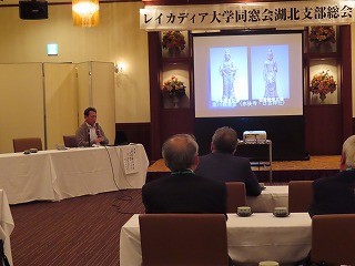 本年度の定期総会は、昨年度に続き会員出席による定期総会・研修会・懇親会が行われました。 総会・記念講演には26名、懇親会には19名の参加者で賑わいました。サポートの会より学生募集の依頼があり、 その後総会が行われました。レイカディア賛歌斉唱の後、議事が粛々と進行され、全ての議事内容が承認されました。 記念講演では元高月観音の里歴史民俗資料館学芸員の佐々木悦也様に「湖北の観音さま~その信仰と文化~」 という演題で1時間の講演をしていただきました。パワーポイントで多くの観音さまを詳しく説明していただき、 湖北の観音信仰の歴史や文化を深く理解することが出来ました。最後に、井上靖の「星と祭」の一節も紹介していた だきました。湖北の観音さまの事を改めて知り、再び読んでみようと思われた方も多かったのではないでしょうか。 その後行われた懇親会は、会員同士の和気藹々とした交流の場となりました。非常に楽しい2時間でした。 本年度も湖北支部として様々な事業が計画されています。多くの会員の皆さんが参加されることを期待しています。 |