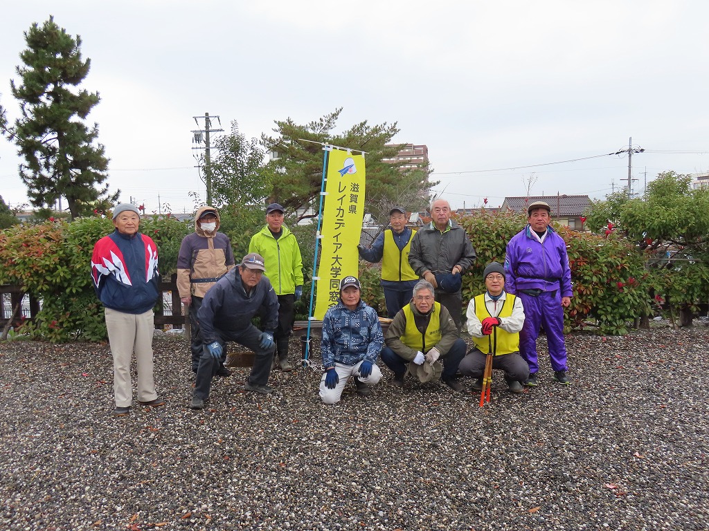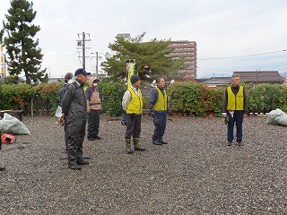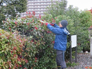 | 昨年度に続き、長浜城歴史博物館玄関前庭の剪定作業が実施されました。同窓会は、支部役員を中心に10名の 参加者でした。また、長浜城歴史博物館関係者や友の会の皆さんには剪定した樹木の袋づめの協力をいただきました。 小雨が時折降る中でしたが、何とか剪定作業を行うことが出来ました。昨年と同様、伸び放題になっていた樹木の高さ を揃える剪定が中心で、トリマー、剪定ばさみ、ノコギリ、両手ばさみ等を使いながら行いました。 背の高い樹木は三脚を 使いながらの作業となりました。雨が降っていたこともあり、1時間半ほどの作業でしたが、無事に終えることが出来ました。 剪定された大量の枝や葉は細かく裁断されてビニール袋などに袋詰めして自転車庫に運び込み作業は終わりました。 剪定後の玄関前庭は見違えるようにさっぱりしました。館長さんには、これで気持ちよく新しい年を迎えらると言って いただけました。少しでも長浜市に貢献できたことをうれしく思います。 |