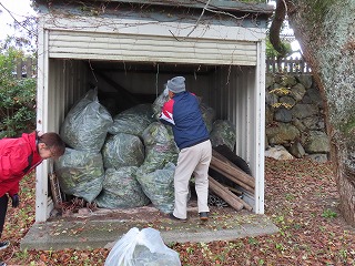 | 作業後の挨拶 | 袋詰めされた樹木 | 倉庫に運び込まれた袋 |