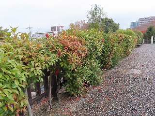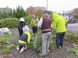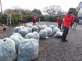 | 年末のこの時期、例年通り長浜城歴史博物館玄関前庭の剪定作業が実施されました。同窓会は、支部役員を中心に9名の 参加者でした。また、長浜城歴史博物館関係者や友の会の皆さんには剪定した樹木の袋づめなどの協力をいただきました。 小雨が時折降る中でしたが、何とか剪定作業を行うことが出来ました。昨年と同様、伸び放題になっていた樹木の高さ を揃える剪定が中心で、トリマー、剪定ばさみ、ノコギリ、両手ばさみ等を使いながら行いました。 背の高い樹木は三脚を 使いながらの作業となりました。雨が降っていたなか、止み間を伺いながらの2時間ほどの作業でしたが、無事に終えることが 出来ました。 剪定された大量の枝や葉は細かく裁断されてビニール袋などに袋詰めして作業は終わりました。 剪定後の玄関前庭は見違えるようにさっぱりしました。館長さんには、これで気持ちよく新しい年を迎えらると言っていただけ ました。来年は豊臣兄弟のテレビ放送が始まります。長浜城歴史博物館を訪れる観光客の方も増えると思われますが、気持ち よく迎えることに少しでも貢献できたことをうれしく思います。 |