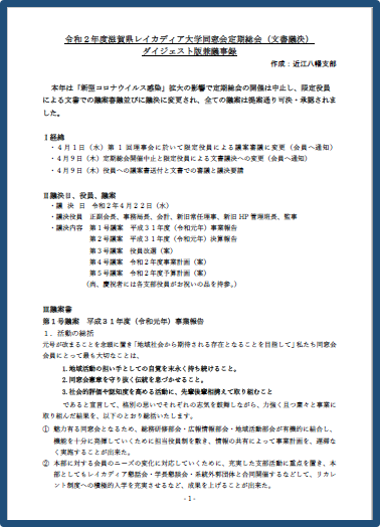 防止の観点から今年度に限り、総会は中止し新旧役員による文書議決になりました。
