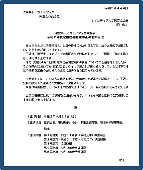 令和2年4月22日予定していました定期総会は新型コロナウイルスの感染拡大